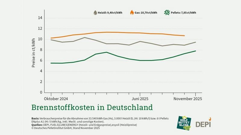 „Ein Preisanstieg im Herbst ist grundsätzlich typisch, da sich der Markt mit Beginn der Heizsaison üblicherweise kontinuierlich belebt. Wer es versäumt hat, in Frühjahr und Sommer sein Lager zu befüllen, muss in der Heizperiode nachfüllen und bezahlt hierbei höhere Preise“, erklärt DEPI-Geschäftsführer Martin Bentele. „In diesem Jahr fällt der Anstieg etwas stärker aus, was unter anderem auf höhere Kosten in der Produktion und Logistik zurückzuführen ist.“