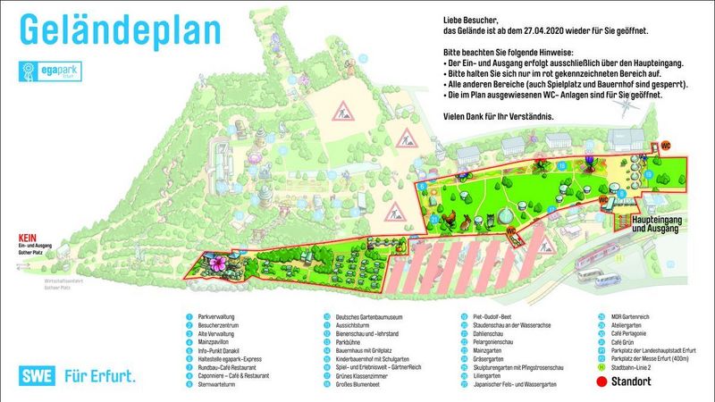Für die Öffnung unter den neuen gesetzlichen Rahmenbedingungen haben die egapark-Verantwortlichen ein Schutzkonzept zur Einhaltung der geltenden Abstands- und Hygieneregeln erarbeitet. Das sieht vor, dass sich aufgrund der durchzusetzenden Abstandsregelungen auf dem Parkareal gleichzeitig 3.150 Besucher im egapark aufhalten dürfen, da nur ein Drittel des Parkgeländes zugänglich ist. Mittels Zählung wird sichergestellt, dass die maximale Besucherzahl nicht überschritten wird. Der Zutritt ist deshalb nur über den Haupteingang möglich. Die Eingänge Gothaer Platz sowie Burg-Gleich-Weg bleiben geschlossen. Die geöffnete Kasse verfügt über entsprechende Schutzmaßnahmen für Besucher und Mitarbeiter.