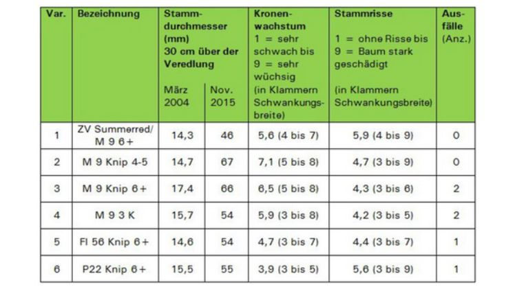 Die Stämme der Bäume waren zur Pflanzung mit 14 bis 16 mm Durchmesser fast gleich stark. Nur die gut verzweigten Knipbäume auf M 9 in Variante 3 waren mit 17 mm etwas kräftiger (Tab. 2). Im 11. Standjahr (2015) besaßen die Knipbäume auf M 9 (Var. 2 und 3) mit rund 66 mm die stärksten Stämme. Bei Zwischenveredlung mit Summerred (Var. 1) waren die Stämme mit 46 mm besonders schwach. Die Stämme der 3K-Bäume und der Knipbäume auf Fleuren 56 (FL 56) und P22 maßen rund 54 mm im Durchmesser.