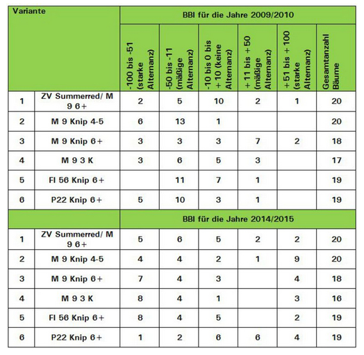 Die Anzahl stark alternierender Bäume nahm von 2009/10 auf 2014/15 zu. Bei den Knipbäumen auf M 9 (Var. 2 und 3) und den 3K-Bäumen waren nur noch wenige Bäume ohne Alternanz, über die Hälfte der Bäume alternierte sogar stark. Ebenso war die Mehrheit der Knipbäume auf der Unterlage FL 56 aus dem Gleichgewicht geraten. Bei den Knipbäumen auf P22 war die Alternanz am geringsten. Mäßige Alternanz wiesen die Bäume mit Zwischenveredlung Summerred auf.