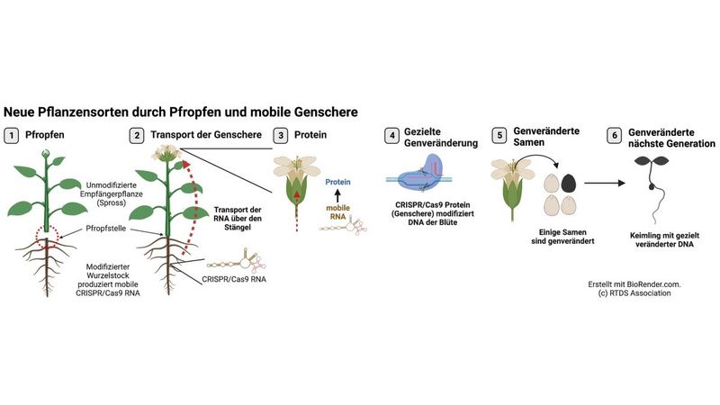 Um dies zu erreichen, schnitten die Forscher*innen den Stängel einer Pflanze, deren Zellkerne DNA der Genschere enthalten, über dem Wurzelstock ab und pfropften den Spross einer genetisch unveränderten Empfängerpflanze darauf. Wie die Arbeitsgruppe um Friedrich Kragler bereits in früheren Arbeiten herausgefunden hat, können Wurzelstock mRNAs mit bestimmten Eigenschaften bis zum Blütengewebe transportiert werden. Die Forscher haben daher die DNA Sequenz der Genschere so angepasst, dass die mRNA Kopien aus dem Wurzelstock in die genetisch nicht veränderten, oberirdischen Teile verschickt werden. Dort wird dann auch in den Blüten der Pflanze aus der mRNA das Genscheren-Protein hergestellt, was die entsprechenden Veränderungen in den Pflanzenzellen hervorruft. Ein Teil der Samen, die aus diesen Blüten hervorgehen trägt dann bereits in der nächsten Generation die gewünschte Genveränderung. Sie sind aber frei von jeglicher Fremd-DNA und von natürlich entstandenen Varianten nicht zu unterscheiden.