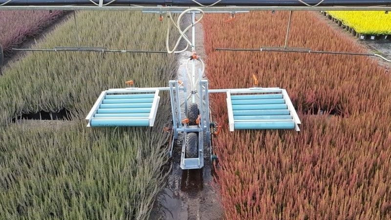 Gewaschen werden die Töpfe nun über in verschiedenen Höhen arbeitende Wasserdüsen an beiden Seiten des Topfwaschwagens. Die Düsen können – ebenfalls per Schnellverschluss - auf alle Topfgrößen eingestellt werden. Der Wasserdruck reicht aus, um die Töpfe mehrere Reihen tief zu reinigen. Läuft der Waschwagen danach auf der anderen Beetseite, werden so alle Töpfe eines Beetes erreicht. Optimal sind Beet-Breiten um 150-160 cm, bis 200 cm ist möglich. Für kleinere und leichtere Töpfe kann zusätzlich ein Walzenrahmen montiert werden, der ein Umkippen sicher verhindert. (Klose/Derksen)