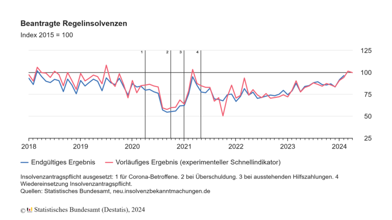 Die Zahl der beantragten Regelinsolvenzen in Deutschland ist nach vorläufigen Angaben des Statistischen Bundesamtes (Destatis) im April 2024 um 28,5% gegenüber dem Vorjahresmonat gestiegen. Im März 2024 hatte sie um 12,3% gegenüber März 2023 zugenommen. Seit Juni 2023 sind damit durchgängig zweistellige Zuwachsraten im Vorjahresvergleich zu beobachten. Über einen längeren Zeitraum betrachtet liegt die Zahl der Regelinsolvenzen zwischen Mai 2023 und April 2024 jedoch in etwa auf dem Vor-Corona-Niveau des Zeitraums Mai 2019 bis April 2020. Bei den Ergebnissen ist zu berücksichtigen, dass die Anträge erst nach der ersten Entscheidung des Insolvenzgerichts in die Statistik einfließen. Der tatsächliche Zeitpunkt des Insolvenzantrags liegt in vielen Fällen annähernd drei Monate davor. Die Insolvenzstatistik bildet nur Geschäftsaufgaben ab, die im Zuge eines Insolvenzverfahrens ablaufen, nicht jedoch solche aus anderen Gründen beziehungsweise vor Eintritt akuter Zahlungsschwierigkeiten. Diese und weitere Hinweise sind bei der Interpretation der Insolvenzstatistiken zu beachten.