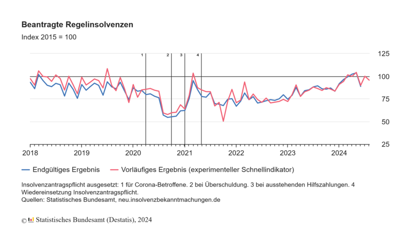 Die Zahl der beantragten Regelinsolvenzen in Deutschland ist nach vorläufigen Angaben des Statistischen Bundesamtes (Destatis) im August 2024 um 10,7% gegenüber dem Vorjahresmonat gestiegen. Mit Ausnahme des Juni 2024 (+6,3%) liegt die Zuwachsrate damit seit Juni 2023 im zweistelligen Bereich. Bei den Ergebnissen ist zu berücksichtigen, dass die Anträge erst nach der ersten Entscheidung des Insolvenzgerichts in die Statistik einfließen. Der tatsächliche Zeitpunkt des Insolvenzantrags liegt in vielen Fällen annähernd drei Monate davor.