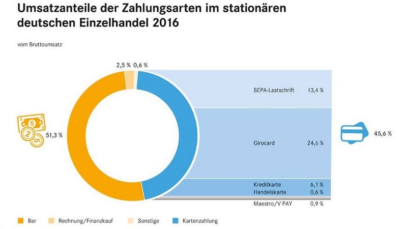 Kartengestützte Umsätze verzeichnen 2016 einen deutlichen Zuwachs um 9,1 Mrd. Euro auf insgesamt 187 Mrd. Euro. Das entspricht einem Anteil von 45,6% (Vorjahr 44,5%) am Gesamtumsatz der Einzelhandelsgeschäfte in Höhe von 410 Mrd. Euro.