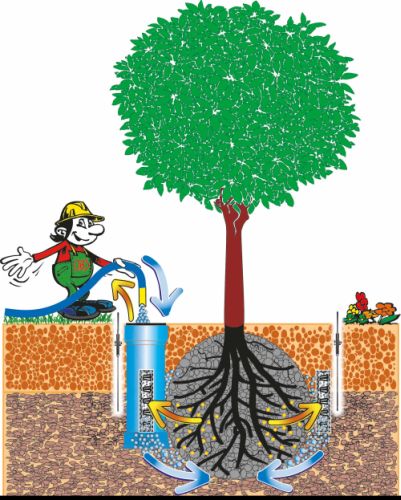 Speziell für das wirtschaftliche, effiziente und nachhaltige Wässern, Düngen und Belüften von Bäumen bei Neupflanzungen hat die OBS Objekt-Begrünungs-Systeme GmbH, Unna, das GreenDrain Baumbewässerungssystem ND TIS entwickelt. Es besteht aus dem 500 mm hohen Polypropylenrohr ND TIS-Basic, das als Verbindungs-, Bewässerungs- und Entlüftungsrohr genutzt wird und dem CE-markierten Bewässerungs- und Belüftungsstreifen ND-Strip 150 oder 300. Bei Bedarf kann das System in 50 cm Schritten aufgestockt werden.