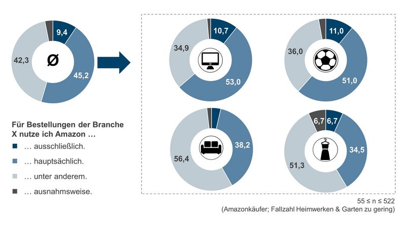 - Jeder zehnte Amazon-Käufer (9,4%) kauft online ausschließlich bei Amazon, 45,2% hauptsächlich.