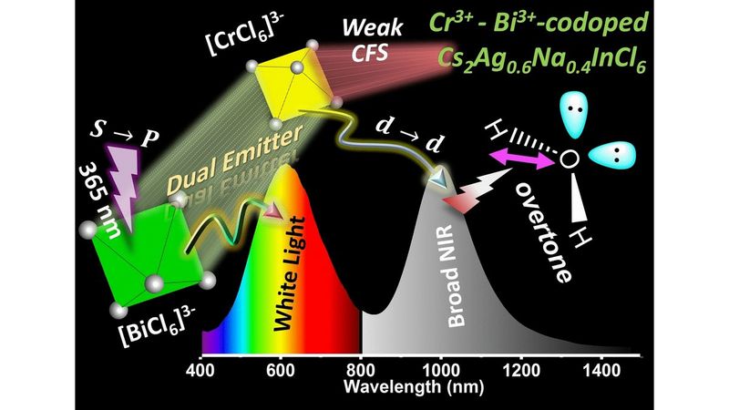 Diese bestand aus einem doppelten, sowohl mit Bismut als auch mit Chrom dotierten Perowskitkristall. Wie die Forschenden feststellten, strahlte die Bismutkomponente warmweißes Licht aus, während die Chromatome einen Teil der Energie in eine starke Bande im Nahinfrarot abgaben.