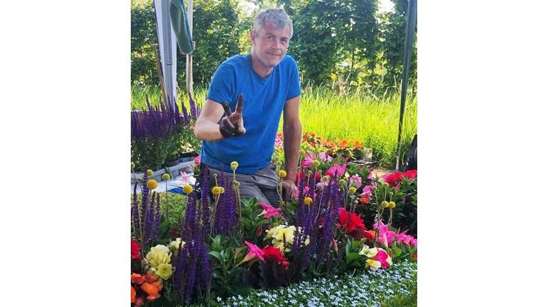 Vorher habe ich mich mehrfach mit einem Kollegen ausgetauscht, der schon an Bundesgartenschauen teilgenommen hat. So entwickelten sich die ersten Konzeptideen, die ich aber kurz vor der BUGA wieder verworfen habe. Dann habe ich den Grabstein in Originalgröße aus Styropor nachgebaut, das Grab in der Gärtnerei als Modell aufgebaut und neugestaltet. Es entstand die Idee, die geschwungenen Linien des Grabzeichens sowohl mit den Bodendeckern als auch mit dem Wechselflor aufzunehmen. Auch das spiralig gewachsene Gehölz, eine Leyland-Zypresse (Cupressocyparis leylandii 'Gold Rider') nimmt die Bewegung auf – so wie im wirklichen Leben alles in Bewegung ist und niemals alles ganz ruht. Dennoch soll das Grab eine gewisse Ruhe ausstrahlen. Der Wechselflor und auch die Bodendecker sind alle recht farbig und bunt, um in aller Trauer auch eine gewisse Fröhlichkeit zu vermitteln. Das sind im Sommerflor sehr schöne, zitronengelbe Solenia-Begonien, dazu dann dicke gefüllte Begonien in dunkelrot mit fast handflächengroßen Blüten. Darunter haben wir pinkfarbene Dipladenia und blau blühenden Salbei gemischt. Farbe geben auch die Bodendecker – der Bubikopf (Isotoma fluviatilis 'Blue Foot'), der hellblau blüht, dazu die goldene Kriechspindel (Euonymus fortunei 'Emerald'n Gold') und die Heckenmyrte (Lonicera nitida 'Maigrün'), die ebenfalls Farbe liefert.