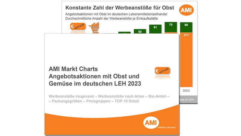 Nutzen Sie die AMI Markt Charts Angebotsaktionen mit Obst und Gemüse im deutschen LEH 2023 und verschaffen Sie sich einen umfassenden Überblick. Die Chartsammlung ist ab sofort lieferbar. Jede PDF-Version hat mehr als 100 Folien und kostet jeweils 607,00 EUR zzgl. 7 % MwSt.
