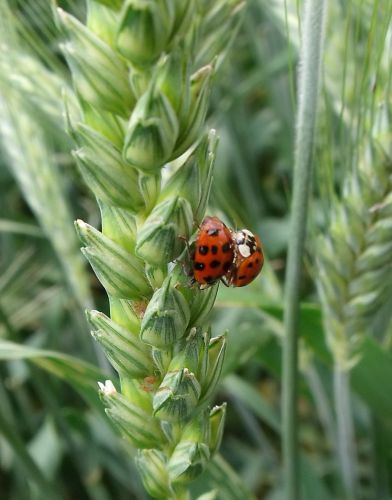 Sowohl der einheimische Siebenpunkt-Marienkäfer, Coccinella septempunctata, als auch der Asiatische Marienkäfer, Harmonia axyridis, sind effektive Gegenspieler der Großen Getreideblattlaus, Sitobion avenae, an Winterweizen. Wissenschaftler des Julius Kühn-Instituts (JKI) wollten wissen, welcher der beiden Fressfeinde mehr von der zu erwartenden Klimaerwärmung profitiert. Dazu wurde im Rahmen eines von der Bundesstiftung Umwelt geförderten Forschungsprojektes das Fressverhalten und andere Lebensparameter beider Arten in Klimakammern untersucht. Die nun vorliegenden Ergebnisse legen nahe, dass bei einer durchschnittlichen Temperaturerhöhung um drei Grad der heimische Siebenpunkt in Sachen Futterverwertung die Nase vorn hat.