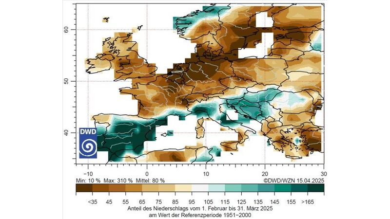 Ein Blick auf die Daten des vom DWD im Auftrag der Weltorganisation für Meteorologie (WMO) betriebenen Weltzentrums für Niederschlagsklimatologie zeigt: Die Monate Februar und März 2025 waren nicht nur in Deutschland, sondern in einem breiten Streifen von den Britischen Inseln über Mitteleuropa bis in das östliche Europa hinein teils deutlich zu trocken. Das Zentrum des Niederschlagsdefizits erstreckte sich dabei von den Beneluxstaaten über Norddeutschland bis zur schwedischen Ostseeküste sowie ins Baltikum. Teilweise wurden in diesem Gebiet im Februar und März unter 20% des vieljährigen Niederschlagsmittels der Referenzperiode 1951-2000 erfasst. Im südlichen Europa war es im selben Zeitraum dagegen weitgehend zu nass. So wurden in der Südhälfte Spaniens und Portugals verbreitet mehr als 165% und regional auch über 200% der dort üblichen Niederschlagsmengen gemessen.