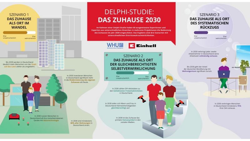 Die WHU Otto Beisheim School of Management hatte 60 ausgewiesene Expertinnen und Experten über Zukunftsthesen diskutieren lassen und diese Beiträge für die Einhell Delphi-Studie „Das Zuhause 2030“ ausgewertet. „Wir wollten keine Vielzahl von Einzelstimmen, wie bei Umfrage-basierten Studien, sondern eine fundierte Expertise der Experten, um so eine umfassende Perspektive auf das Thema zu bekommen“, erklärt Studienleiter Professor Dr. Sascha L. Schmidt, Leiter des Center for Sports and Management der WHU Otto Beisheim School of Management, das die Delphi- Studie im Auftrag von Einhell durchgeführt hat.