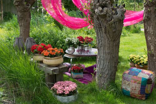 Die Kalanchoë besticht sowohl draußen als auch drinnen mit ihren unzähligen farbenprächtigen Blüten. Als aus Asien und Afrika stammende Exotin bevorzugt sie warme und sonnige Standorte und fühlt sich ab Juli auf Balkon und Terrasse am wohlsten. In dieser Draußen-Saison wird die Kalanchoë im angesagten Oriental Style inszeniert, einem Mix aus asiatischen Dekorationen und indischer Lebensfreude. Die leuchtend orange-, rot- und gelbblühenden Sorten der Kalanchoë erinnern an die Farbwelten des Morgenlands, darauf abgestimmte Pflanzgefäße mit Ornamenten und geometrischen Mustern greifen den Orient-Look auf. Auch die Einrichtung und Dekoration des übrigen Außenbereichs darf sich gern an der Vision des fernen Ostens orientieren: Silberkannen und -tabletts, bunt gemusterte Sitzkissen und leichte Seidentücher schaffen eine orientalisch angehauchte Wohlfühlatmosphäre. Für größere Gärten bieten Hängematten ein besonderes Gefühl der Entspannung. Eine etwas zurückhaltendere Variante des orientalischen Stils ist die Gestaltung in Erdtönen anstelle von knalligen Farben. Kalanchoë-Pflanzen mit Blüten in Rosa oder Weiß sind die passenden Begleiter für die Lightversion der fernöstlichen Dekoration und setzen farbliche Akzente, ohne aufdringlich zu sein.