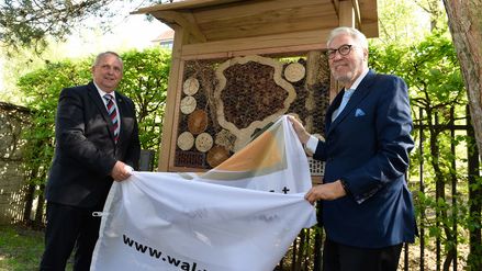 Der Minister für Landwirtschaft und Umwelt Mecklenburg-Vorpommern, Dr. Till Backhaus (l.), und der Alleinvorstand der Deutschen Wildtier Stiftung, Prof. Dr. Fritz Vahrenholt, enthüllten in der Landesvertretung MV in Berlin ein Insektenhotel. Gefertigt durch den Landesforstbetrieb, soll es dauerhaft im Ministergarten der Landesvertretung Insekten inmitten des Berliner Regierungsviertels einen geschützten Rückzugsraum bieten. Bild: Landesvertretung MV/Stefan Gloede.