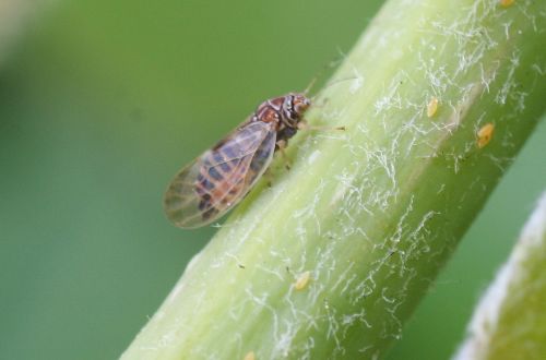 Der Birnenblattsauger verdirbt also nicht nur die Blätter und Triebe, sondern auch die Früchte, die dadurch unverkäuflich werden. Massiver Befall kann nach Auskunft des Kompetenzzentrums Obstbau Bodensee (KOB) im Folgejahr verkahlte Triebe, verkümmerte Blütenknospen und winzige Früchtchen zur Folge haben. Doch damit nicht genug: Der Birnenblattsauger gilt darüber hinaus als Überträger des Birnenverfalls, einer bakteriell ausgelösten Krankheit der „Phytoplasmose“.