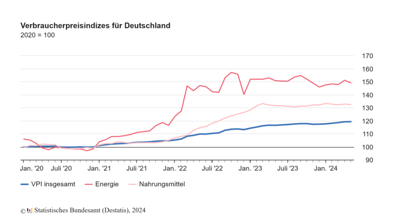 Im Mai 2024 lag die Inflationsrate ohne Energie bei +2,8%. Die Inflationsrate ohne Berücksichtigung von Nahrungsmitteln und Energie, häufig auch als Kerninflation bezeichnet, lag bei +3,0%. Diese Kenngrößen verdeutlichen auch, dass die Teuerung in anderen wichtigen Güterbereichen über der Gesamtteuerung lag. Die Veränderung des Verbraucherpreisindex ohne Nahrungsmittel und Energie gegenüber dem Vorjahresmonat hatte im April 2024 ebenfalls 3,0% betragen und liegt seit Januar 2024 deutlich über der Gesamtteuerung.