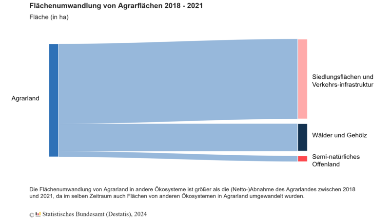Im Jahr 2021 wurden in Deutschland rund 18,9 Mio. Hektar Agrarland intensiv bewirtschaftet, das entsprach 54% der Landfläche. Wie das Statistische Bundesamt (Destatis) mitteilt, ging die intensiv bewirtschaftete Agrarfläche damit zwischen 2018 und 2021 um rund 58.000 Hektar zurück. Der Großteil des Rückgangs entfiel auf Wiesen und Weiden (-45.000 Hektar), ein kleinerer Teil (-14.000 Hektar) auf Ackerland. Die Fläche der aus ökologischer Sicht besonders wertvollen extensiv genutzten Grünflächen wie etwa Heideland oder Bergwiesen und die Fläche der Feuchtgebiete wuchs dagegen von 2018 bis 2021 zusammen nur um 1.800 Hektar. Insgesamt machten diese für den Erhalt der Artenvielfalt besonders wichtigen Flächen im Jahr 2021 mit rund 451.000 Hektar nur einen Anteil von 1% der Landfläche Deutschlands aus.
