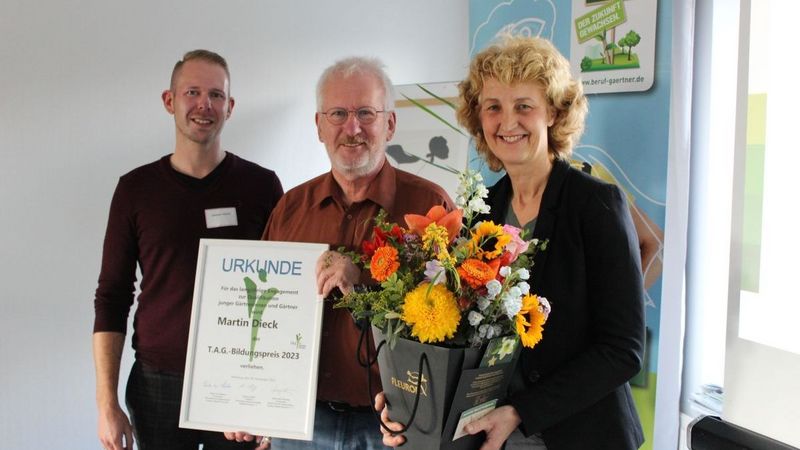Der T.A.G. Bildungspreis 2023 wurde an den ehemaligen Berufsschullehrer Martin Dieck verliehen. Martin Dieck hat sich seit 1994 mit Engagement, Herzblut und Pflanzenliebe für über 1000 Meister*innen im Gartenbau und viele Nachwuchsgärtner*innen als Berufschullehrer eingesetzt. Seine ehemalige Kollegin Dr. Linda Groot von der Justus-von Liebig-Berufsschule Hannover-Ahlem lobte Martin Dieck als besonderen Menschen, sowie für seinen unermüdlichen Einsatz und seine inspirierende Wissensweitergabe. Einen großen Dank sprach dem Geehrten ebenso sein ehemaliger Schüler Sebastian Abassi in einer emotionalen Laudatio aus.