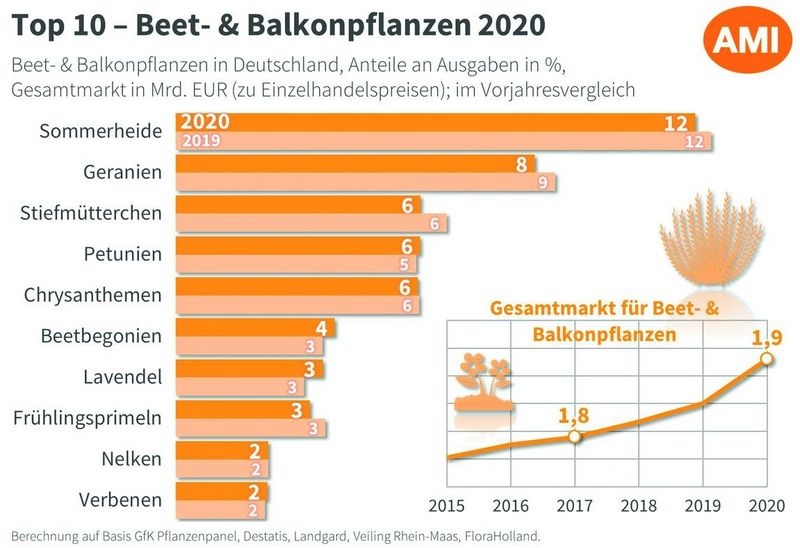 Beet- & Balkonpflanzen waren im Jahr 2020 sehr beliebt. Der Markt wuchs um 4,3% auf mehr als 1,9 Mrd. Euro. Pro Kopf gaben die Deutschen mehr als 23 Euro für Beet- & Balkonpflanzen aus. Dabei wurden die Pflanzen oftmals nach Verfügbarkeit gekauft und die Ausgaben für viele kleinere Kulturen stiegen, viele der Bestseller verloren hingegen. So auch die Sommerheide, welche aber noch immer die Folge der Top 10 mit 12% Anteil an den Ausgaben anführt. Die Geranie fiel auf etwas über 8% zurück. Sie setzte ihren Negativtrend der vergangenen Jahre fort. Stiefmütterchen und Frühlingsprimeln verloren deutlich, die Gänseblümchen verschwanden ganz aus der Top 10. Die Sommerpflanzen, wie Petunien, konnten Plätze gut machen. Manche blieben stabil im Markt, wie etwa die Chrysanthemen. Beetbegonien, aber auch Lavendel steigerten die Ausgabenanteile etwas.