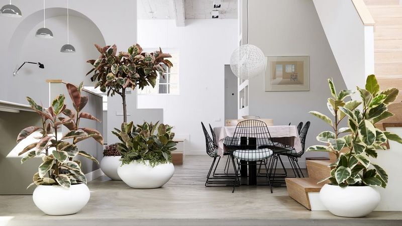 Großblättrige Ficus kommt am besten zur Geltung, wenn die Pflanzen vor einem hellen Hintergrund frei stehen können, so dass sich die Aufmerksamkeit tatsächlich auf die großen Blätter richtet. Stellen Sie die Beleuchtung so ein, dass sie auch auf die Vorderseite der Pflanze fällt, um den Glanz und die Zeichnungen der Blätter zu unterstreichen. Präsentieren Sie die Pflanze in einem dekorativen Übertopf, der sofort eine gemütliche Atmosphäre ausstrahlt und die Hemmschwelle überwindet, auch noch einen Topf für diesen grünen Riesen finden zu müssen. (BBH)
