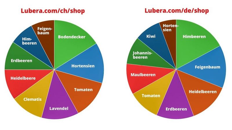 Dank dem hohen Traffic auf Lubera.com – zurzeit etwa 200.000 Besucher wöchentlich – kann Lubera Rückschlüsse über das Such- und Kaufverhalten von Privatkunden ziehen. Diese Zahlen basieren auf den ausgewerteten Suchbegriffen, nach denen in den letzten 4 Monaten auf Lubera.com/shop gesucht wurde. Der Vergleich zeigt interessante Unterschiede zwischen Deutschland und der Schweiz. Shopbesucher haben eine starke Kaufpräferenz, an den Zahlen ist also ablesbar, welche Artikelgruppen besonders stark nachgefragt werden.