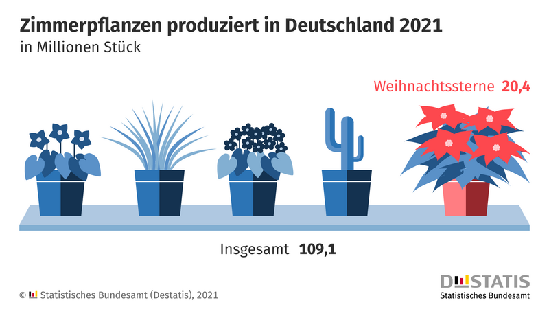 Wie das Statistische Bundesamt mitteilt, ist fast jede fünfte in Deutschland produzierte Zimmerpflanze 2021 ein Weihnachtsstern. Insgesamt zogen die Gartenbaubetriebe 20,4 Mio. als verkaufsfertige Topfpflanzen (Fertigware) auf.
