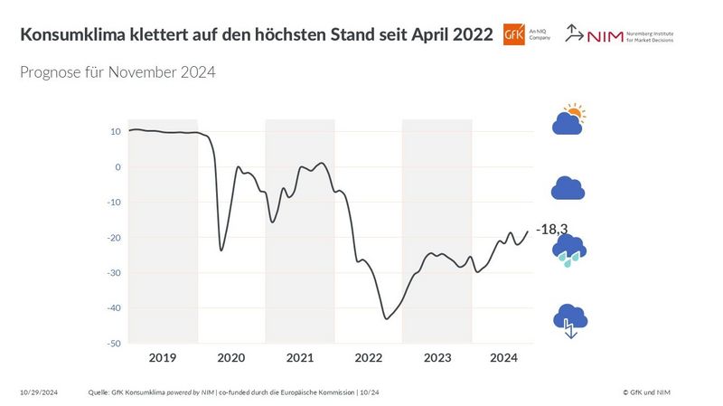 Für November wird für das Konsumklima im Vergleich zum Vormonat (revidiert -21,0 Punkte) ein Anstieg von 2,7 Zähler auf -18,3 Punkte prognostiziert. Dies ist der höchste Wert seit April 2022 – wobei das Niveau des Konsumklimas nach wie vor niedrig ist. Zur gesamtwirtschaftlichen Entwicklung äußern sich die deutschen Verbraucher allerdings erneut etwas pessimistischer. Dies zeigen die aktuellen Ergebnisse des GfK Konsumklimas powered by NIM. Es wird seit Oktober 2023 gemeinsam von GfK und dem Nürnberg Institut für Marktentscheidungen (NIM), Gründer der GfK, herausgegeben.