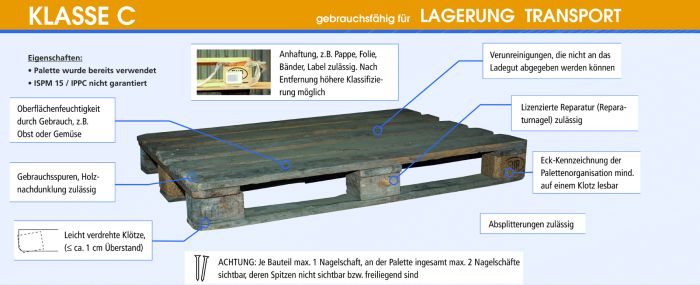Wann ist eine Palette nicht mehr tauschfähig? Kann sie noch für das Hochregallager verwendet werden? Ist sie maschinengängig und fördertauglich? Am Wareneingang bleibt keine Zeit für lange Fragen, hier sind schnelle Entscheidungen gefragt. Industrie, Handel, Logistik und Palettendienstleister haben deshalb gemeinsam mit GS1 Germany die bereits 2011 entwickelte Anwendungsempfehlung und die Qualitätskriterien zum Palettentausch konkreter an die aktuellen Anforderungen angepasst. Ein Poster mit den vier erarbeiteten Qualitätsklassen Neu, A, B, und C unterstützt die schnelle Sortierung der Paletten an der Rampe.