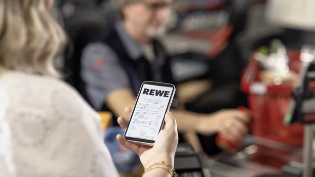 Seit 1. Januar 2020 gilt in Deutschland die Pflicht zur Belegausgabe – auch dann, wenn Kund:innen keinen Beleg wünschen. Die Papiermenge, die im Handel ausgedruckt werden muss und oft direkt weggeworfen wird, ist seitdem gestiegen. Der eBon in der REWE-App soll jetzt helfen, den Papierverbrauch zu reduzieren. (REWE)