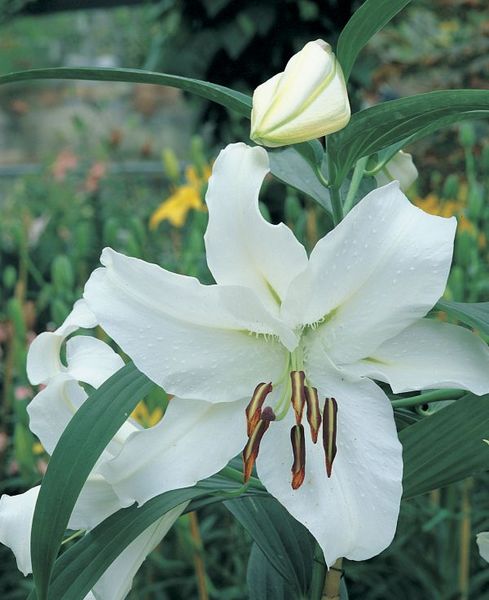 Die etwa 110 cm hohe Orientalische Lilie ‘Casa Blanca‘ ist eine eindrucksvolle Gartenschönheit, die je nach Pflanzzeitpunkt im Juli oder August blüht. Sie bietet viele gestalterische Möglichkeiten und ist außerdem eine ausgezeichnete Schnittblume. Ihre Blüten sind mit einem Durchmesser von bis zu 25 cm sehr groß. Die dunklen Staubgefäße bilden einen schönen Kontrast zu dem strahlenden Weiß der elegant zurückgebogenen Blütenblätter. Das zarte Grün in der Blütenmitte wirkt fast wie ein kleiner Stern. ‘Casa Blanca‘ gehört zur Gruppe der Orientalischen Lilien. Ihre Blüten verströmen, wie viele der Orientalischen Lilien, einen angenehmen Duft. Sie hat damit sogar in der Welt des Parfums Karriere gemacht: Die New Yorker Modedesignerin Donna Karan liebt weiß blühende Blumen wie die ‘Casa Blanca‘ und hat den Duft dieser Lilie in eines ihrer Parfums einfließen lassen.
