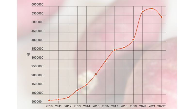 Noch vor rund 10 Jahren waren Süßkartoffeln in der Schweiz praktisch unbekannt. Nur 672.000 kg wurden importiert. Dann setzte der massive Boom ein: 2021 der Höhepunkt mit 5.865.672 kg. Da hatte sich der Anstieg jedoch schon etwas verlangsamt und letztes Jahr gingen die Importe erstmals zurück, bleiben aber auf hohem Niveau. Der Import-Peak könnte überschritten sein.