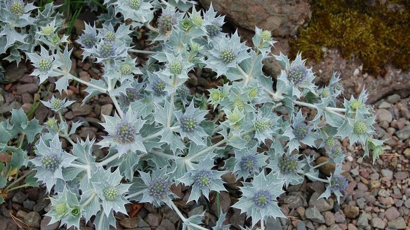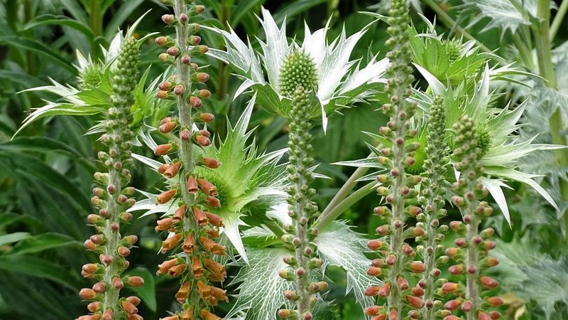 Viele Mannstreu-Arten etwa erinnern an stolze Ritter, die sich zum Turnier rüsten. Metallisch glänzend funkelt beispielsweise das Elfenbein-Mannstreu ‚Silver Ghost‘ (Eryngium giganteum) dem Betrachter entgegen. Hocherhobenen Hauptes präsentiert es seine aus unzähligen Einzelblüten zusammengesetzten Blütenhelme, jeder gesäumt von einem zackigen Kragen über grün-silbrigem Laub.