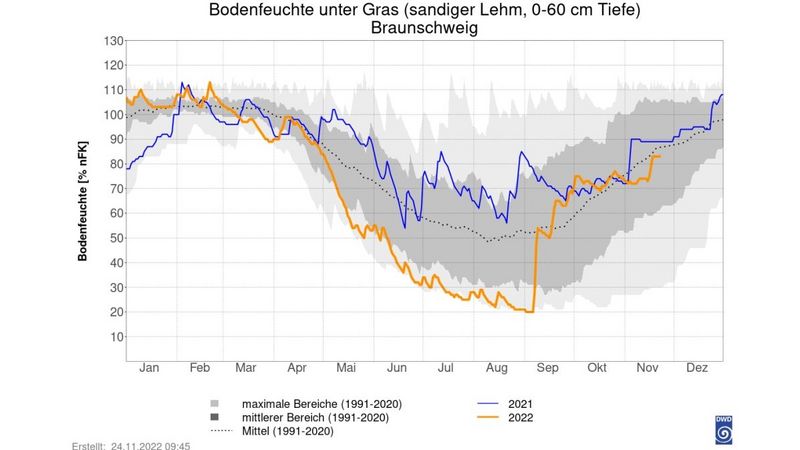 Bodenfeuchteverlauf in der Schicht 0 bis 60 cm Tiefe unter Gras bei sandigem Lehm für das aktuelle Jahr, das Vorjahr, den Mittelwert sowie die Extremwerte der Referenzperiode 1991 bis 2020. Der DWD bietet alle Informationen des Bodenfeuchteviewers im Internet kostenfrei an unter www.dwd.de/bodenfeuchteviewer.