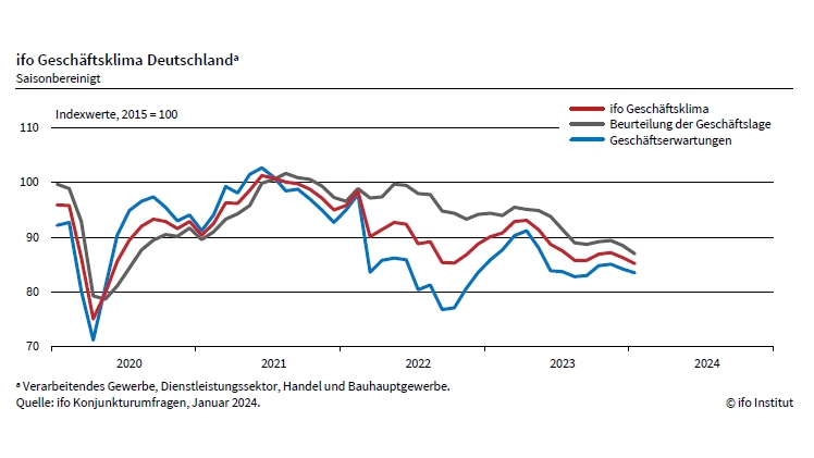 Im Handel ist der Index auf den niedrigsten Wert seit Oktober 2022 gefallen. Die Händler zeigten sich weniger zufrieden mit den laufenden Geschäften. Auch ihre Erwartungen verschlechterten sich. Das gilt sowohl für den Groß- als auch für den Einzelhandel.