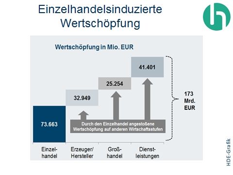Die volkwirtschaftliche Bedeutung des Einzelhandels geht über die Wertschöpfung im eigenen Bereich hinaus. Die Leistungen der Branche strahlen auch auf andere Wirtschaftszweige ab, da die Branche in einen komplexen Wertschöpfungsprozess eingebunden ist. Der Einzelhandel selbst realisiert eine Wertschöpfung von 74 Mrd. Euro. Über die Einbindung in vor- und nachgelagerte Wirtschaftsstufen summiert sich die Wertschöpfungsleistung des Einzelhandels auf 173 Mrd. Euro. (PdH)