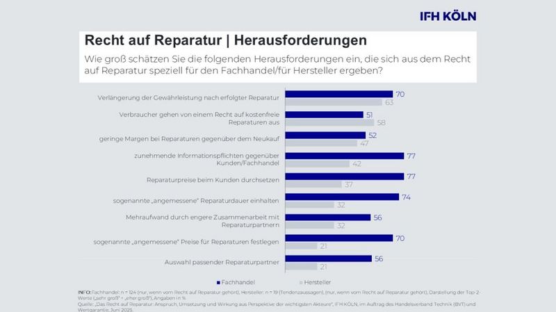 Bis spätestens 31. Juli 2026 muss die Europäische Richtlinie zum Recht auf Reparatur[1] in deutsches Recht umgesetzt werden. Die EU-Richtlinie hat das Ziel, Elektroabfälle zu reduzieren und Ressourcen zu schonen. In Deutschland werden etwas weniger als die Hälfte der defekten Elektrogeräte der in der EU-Richtlinie erwähnten Produktgruppen (49%) nicht repariert. Im Auftrag des Handelsverband Technik (BVT) und des Spezialversicherers und Fachhandelspartners Wertgarantie hat das IFH KÖLN die EU-Richtlinie aus Sicht von Verbraucher:innen, Herstellern, Fachhandel und Ersatzteilwirtschaft in Deutschland erstmalig empirisch untersucht und bietet damit einen 360°-Blick auf die Richtlinie und ihre Auswirkungen auf das Reparaturgeschehen. Die Studie „Das Recht auf Reparatur: Anspruch, Umsetzung und Wirkung aus Perspektive der wichtigsten Akteure" macht deutlich, dass das Recht auf Reparatur bei den Verbraucher:innen bisher noch wenig bekannt ist. Von den Verbraucher:innen, die schon einmal vom Recht auf Reparatur gehört haben (44%), weiß knapp ein Drittel (35%), worum es im Einzelnen geht. Bei den befragten Fachhändlern kennen 98% und bei den Herstellern 95% die EU-Richtlinie, im Detail informiert darüber sind im Fachhandel 55% und bei den Herstellern 95%. „Wenn das Richtlinien-Ziel erreicht werden soll, müssen die Konsumenten besser über die praktischen Möglichkeiten und gesetzlichen Rahmenbedingungen informiert werden. Eine bundesweite Informationskampagne halten wir für sinnvoll, um das Bewusstsein für Reparaturen in Deutschland zu stärken und vorhandene Wissenslücken bei den Verbrauchern zu schließen", erklärt Frank Schipper, Vorsitzender Handelsverband Technik (BVT). Verlängerung der Gewährleistung sowie zeitlicher und personeller Mehraufwand als herausfordernd betrachtet Prinzipiell empfinden Fachhändler und Hersteller die Regelung rund um das Recht auf Reparatur als Chance, um etwa Kontaktpunkte zu Kund:innen zu erhöhen oder auch ihr Serviceangebot zu erweitern. Allerdings überwiegen für einen Großteil der Befragten aus diesen Gruppen die Herausforderungen die Chancen, die die Richtlinie mit sich bringt: So bewerten die in der Richtlinie geforderte Verlängerung der Gewährleistung nach erfolgter Reparatur 70% der Fachhändler und knapp zwei Drittel der Hersteller (63%) als schwierig. Über die Hälfte der Fachhändler (56%) und knapp ein Drittel der Hersteller (32%) befürchten einen Mehraufwand durch die engere Zusammenarbeit mit Reparaturpartnern. Größeres Reparaturvolumen von Herstellern und Fachhändlern kaum zu bewältigen Entscheiden sich Verbraucher:innen dazu, ihr defektes Gerät (aus einer der in der EU-Richtlinie genannten Produktgruppen) reparieren zu lassen, gibt knapp die Hälfte (44%) an, dafür den Kundendienst des Herstellers zu nutzen und knapp ein Viertel (24%) den Fachhandel für Elektrogeräte. In Folge der Richtlinie gehen mehr als die Hälfte der Hersteller (56%) und des Fachhandels (52%) davon aus, dass ihr eigenes Reparaturvolumen steigen wird. Fast drei Viertel der befragten Fachhändler (74%) und knapp die Hälfte der befragten Hersteller (40%) äußern jedoch, mit den aktuell vorhandenen Ressourcen nicht oder nur teilweise auch ein größeres Reparaturvolumen umsetzen zu können. „Die Studie zeigt deutlich, dass die wachsenden Reparaturwünsche der Kunden nur mit ausreichend qualifiziertem Personal erfüllt werden können. Handel und Industrie sind sich einig, dass der Fachkräftemangel eine der größten Herausforderungen bei der Umsetzung des Rechts auf Reparatur ist. Hier sehen wir Handlungsbedarf auch bei der Politik, die notwendige Aus- und Weiterbildung wirkungsvoll zu fördern", so Frank Schipper, Vorsitzender Handelsverband Technik (BVT). Dieser Einschätzung stimmt auch Konrad Lehmann, Vorstand Wertgarantie, zu: „Bereits heute ist die Anzahl an Reparaturen für Fachhändler kaum zu bewältigen. Ohne qualifiziertes Personal wird dem steigenden Reparaturvolumen nicht nachzukommen sein", erklärt Konrad Lehmann und sieht die politischen Handlungsträger in der Verantwortung: „Damit Unternehmen, insbesondere im Bereich des Fachhandels, die ohne Frage bestehenden Chancen des Rechts aus Reparatur nutzen können, ist jetzt die Politik gefordert. Es sind einerseits Ausbildungs- und Schulungsinitiativen notwendig und andererseits klare und einheitliche Rahmenbedingungen. Unterschiedliche Vorgaben auf Länderebene oder ein regulatorischer Flickenteppich würden unnötigen Aufwand erzeugen und für Verunsicherung sorgen." Neue Regelung mit unintendierten Kostenwirkunge In Folge der Umsetzung der Richtlinie zum „Recht auf Reparatur" gehen jeweils über 60% der Fachhandelsunternehmen (68%) und der Hersteller (63%) davon aus, dass die Kosten für eine Reparatur steigen werden. Hersteller und Fachhändler geben dafür ähnliche, teils aber unterschiedlich gewichtete Gründe an. So sehen Fachhändler unter anderem die Erhöhung der Preise für Ersatzteile durch Hersteller (68%), einen zusätzlichen Personalaufwand für Serviceleistungen (58%) und zusätzliche Kosten für die Lagerung von Ersatzteilen (52%) als wichtigste Gründe für steigende Reparaturpreise an. Die Mehrheit der befragten Hersteller sehen im zusätzlichen Personalaufwand für Serviceleistungen (92%), in zusätzlichen Kosten für die Lagerung von Ersatzteilen (83%) und in zusätzlichen Kosten durch die Vorhaltung von diesen (75%) die drei größten Preistreiber für Reparaturen. „Die Ergebnisse der Studie deuten darauf hin, dass die Richtlinie potenziell zu erhöhten Reparaturpreisen führen und damit die mit ihr verbundenen Nachhaltigkeitsbemühungen wie die Reduzierung von Elektromüll konterkariert würde. Hier könnte es sinnvoll sein, auf nationaler Ebene Maßnahmen zu prüfen und zu erarbeiten, um mögliche Teuerungen abzumildern und die Reparaturbereitschaft weiterhin zu fördern", so Dr. Ralf Deckers, Bereichsleiter Strategic Insights & Analytics und M