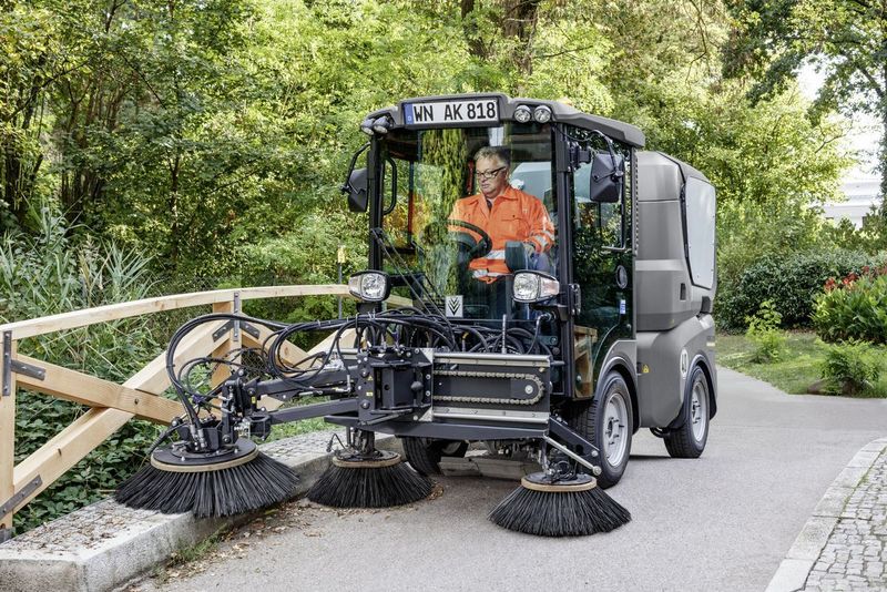 Der Arm des dritten Seitenbesens ist an einer Laufschiene an der Vorderseite des Fahrzeugs angebracht, auf der der Besen hin und her fahren kann. Mit dem Querverschub ist die flächige Wildkrautentfernung über eine Breite von 1.600 mm hinweg möglich – beispielsweise auf Geh- und Radwegen oder Zugängen zu Wohn- und Parkanlagen. Ein weiterer Vorteil: Im selben Arbeitsgang wird der Grünabfall über die Absaugung in den Kehrgutbehälter aufgenommen und kann so komfortabel entsorgt werden. Für die Entfernung von besonders hartnäckigem Unkraut lässt sich der Anpressdruck des dritten Besens über die Fahrzeughydraulik einstellen. Bislang wurde Druck nur durch das Eigengewicht des Besenkopfes erzeugt.