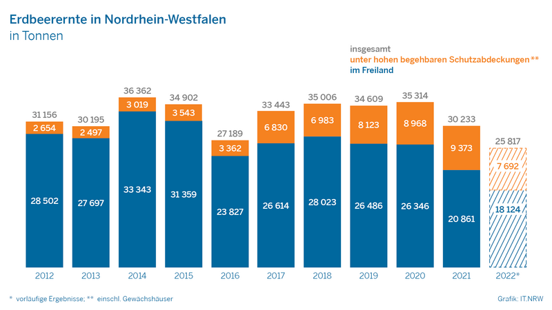 Die nordrhein-westfälischen Erdbeerbetriebe produzierten in diesem Jahr 25.817 Tonnen Erdbeeren. Wie Information und Technik Nordrhein-Westfalen als statistisches Landesamt anhand vorläufiger Ergebnisse der Gemüseerhebung mitteilt, ist das die niedrigste Erdbeerernte der letzten zehn Jahre. Die Erntemenge lag um 14,6% unter dem Ergebnis des Vorjahres (2021: 30 233 Tonnen). 18. 124 Tonnen Erdbeeren (−13,1% gegenüber dem Vorjahr) wurden im Freiland und 7.692 Tonnen (−17,9%) Erdbeeren unter hohen begehbaren Schutzabdeckungen (einschließlich Gewächshäusern) geerntet.