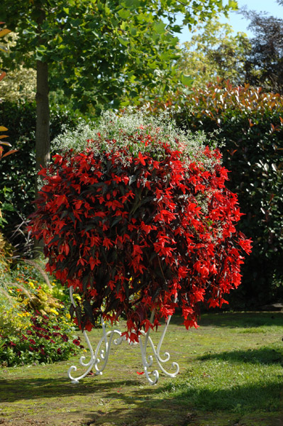 Der Kontrast zu ’Diamond Frost‘ könnte nicht größer sein, doch Gegensätze ziehen sich bekanntlich an und begeistern hier auch zahllose Gartenfans: Die filigranen weißen Blütenschleier des Zauberschnees stieben über den Flammenzungen der Begonie empor wie weißglühende Funken und verleihen ihrer imposanten, halbhängend wachsenden Statur Eleganz und Leichtigkeit. In der vollen Sonne wie im Halbschatten gedeiht das ebenso robuste wie reizvolle Paar ausgezeichnet und sorgt allerorten für Herzklopfen. (Quelle: GMH)