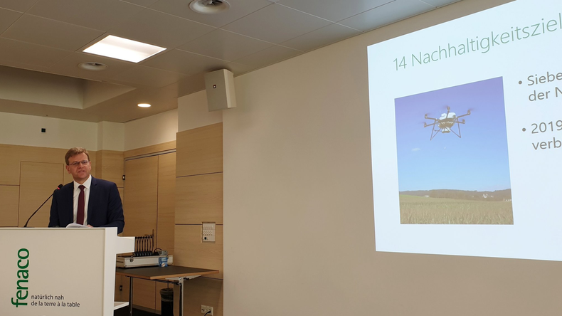 Die Fenaco hat sich 14 Nachhaltigkeitsziele gesetzt. Der Fenaco-Chef hob drei dieser Ziele hervor. "Wir wollen die Führungsrolle im alternativen Pflanzenschutz in der Schweiz einnehmen", so Keller. Als Beispiel nannte er die Bekämpfung des Maiszünslers mit Schlupfwespen, die mit einem Multikopter ausgebracht werden. 12.000 Hektaren werden in der Schweiz bereits so behandelt. Die Technologie wird mittlerweile auch im umliegenden Ausland auf 33.000 Hektaren eingesetzt.