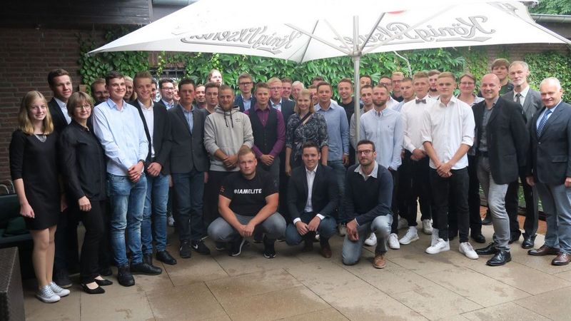 Mit Urkunden und Anstecker ging es für das obligatorische Abschlussfoto nach draußen, ehe zusammen mit den Berufsschullehrern/innen, Ausbildern/innen, Eltern und ehrenamtlichen Vertretern der Kreisverbände und des VGL NRW das Ende der Ausbildungszeit gebührend gefeiert wurde. (GaLaBau-NRW)