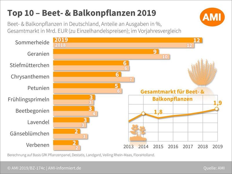 Bei Beet- & Balkonpflanzen konnte sich die Sommerheide auch 2019 mit kleinen Verbesserungen und einem Anteil von 12% an den Ausgaben auf dem Gesamtmarkt auf Platz 1 halten. Der Markt gestaltete sich aber je nach Handelsebene als recht schwierig. Geranien fielen erneut um einen Prozentpunkt zurück. Der Negativtrend der vergangenen Jahre hält weiterhin an. Auch Chrysanthemen verloren deutlich zum Vorjahr. Bei den übrigen Kulturen gab es minimale Verschiebungen. Insgesamt waren die Änderungen jedoch im Nachkommabereich zu suchen. Hier zeigte der Markt für Beet- & Balkonpflanzen durch den schnellen Sortimentswechsel erneut auf, wie stabil sich der deutsche Markt verhält.