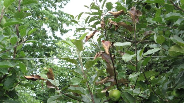 Die Feuerbrand-Krankheit ist meldepflichtig und nur ein früh erkannter Befall an einzelnen Bäumen kann ein Übergreifen z. B. auf kommerzielle Bestände und Obstanlagen verhindern. Feuerbrand ApfelbaumZoombild vorhanden