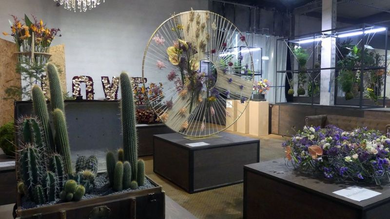 Einen weiter Bogen also, den Niefenecker und Liebrich in den jeweils von ihnen gestalteten Hallenabschnitten schlagen und floristisch umsetzen. Zimmerpflanzen, Schnitt- und Trockenblumen haben die beiden jungen Gestalter für die Umsetzung ebenso verwendet wie Stoffe, Metall, Holz, Glas, Draht oder Kohle und Papier. Die Gestaltung der Hallenschau „In Real Life“ lässt sich unter den Schlagworten „Natur-Inspired“, „Protestkunst, Cartoon Illustration“, Emoji Design und Digitale Welt“ zusammenfassen. Florale Bilder, ein bisschen Pop- und Streetart, aber auch Blumenkunst, um Themen wie die Sorge um Umwelt und Klima sowie Flucht aufzugreifen. In der Hallenschau findet sich auch Werbung für den eigenen Berufsstand wieder. Marketing in eigener Sache, ganz real und nicht virtuell, wenngleich die Generation Z sich in Sachen Berufsorientierung wenig überraschend primär auf Apps und Internetportale konzentriert.