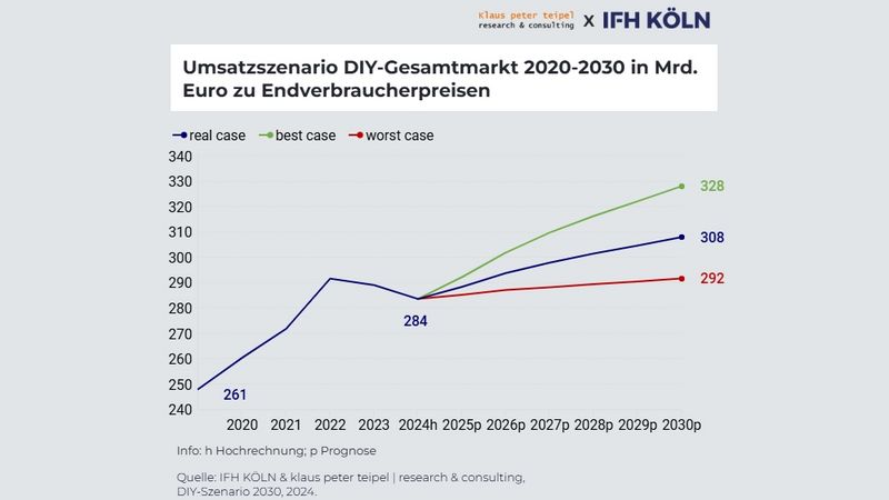 Die Marktexpert:innen von IFH KÖLN und Klaus Peter Teipel analysieren die Dynamiken in der DIY-Branche in verschiedenen Prognose-Varianten. Darin liegen die Wachstumsraten des DIY-Gesamtmarktes bis 2030 in der Real-Case-Szenario-Variante zwischen 1,1 und 1,9%. Bis 2030 wird demnach das nominale Wachstum abnehmen und das Umsatzvolumen im DIY-Markt bei rund 308 Mrd. Euro liegen – ein nominales Plus von 6,5% gegenüber 2023. Im Best-Case-Szenario wird ein Marktumsatz von 328 Mrd. Euro (+13,5%) erwartet, im Worst Case ein Umsatz von 292 Mrd. Euro (+0,9%).