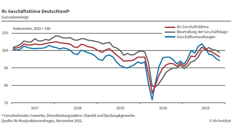 Die Unternehmen waren weniger zufrieden mit ihrer aktuellen Geschäftslage. Zudem zeigt sich zunehmender Pessimismus bei den Erwartungen. Lieferengpässe und die vierte Coronawelle machen den Unternehmen zu schaffen.