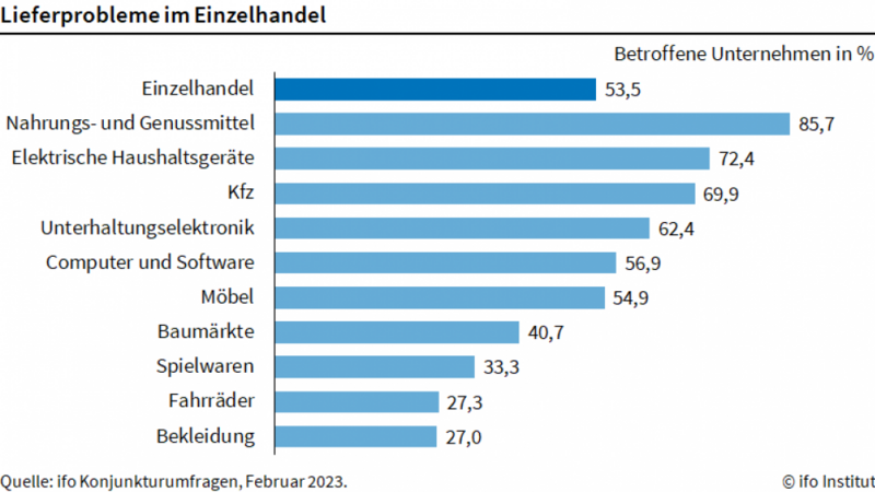Im Einzelhandel insgesamt sind 53,5% der befragten Unternehmen von Engpässen betroffen, nach 57,4% im Januar.