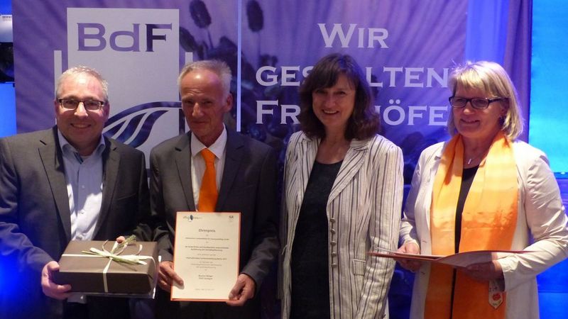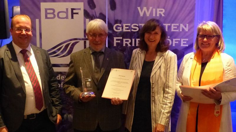 Eine Große Goldmedaille der Deutschen Bundesgartenschau-Gesellschaft mbH (DBG) für die beste Gestaltung einer Urnengrabstelle ging an Gärtnerei Wolfgang Becker aus Rheinbrohl (v. l.n.r.: Jürgen Mertz, Wolfgang Becker, Brigitte Becker, Birgit Ehlers-Ascherfeld). Bild: BdF, Bonn/Margit Wild.