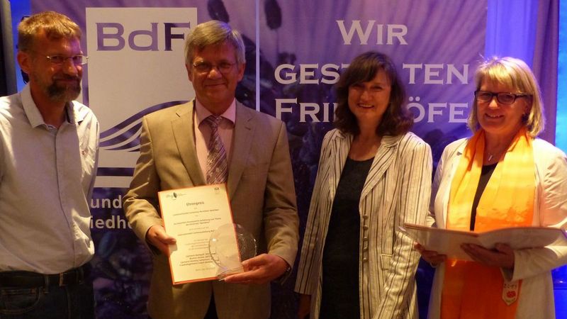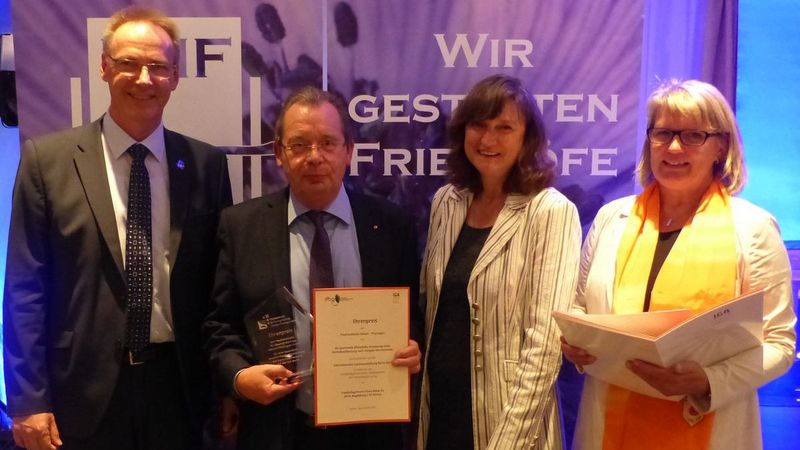 11. Den Ehrenpreis der Treuhandstelle für Dauergrabpflege Hessen-Thüringen GmbH für eine besonders kreative Farbgestaltung der Herbstbepflanzung erhielt Friedhofsgärtnerei Klaus Boese aus Magdeburg (v.l.n.r.: Preisstifter Stefan Friedel, stellvertretender Preisempfänger Armin Kalbe, Birgit Ehlers-Ascherfeld, Renate Behrmann). Bild: BdF, Bonn/Margit Wild.